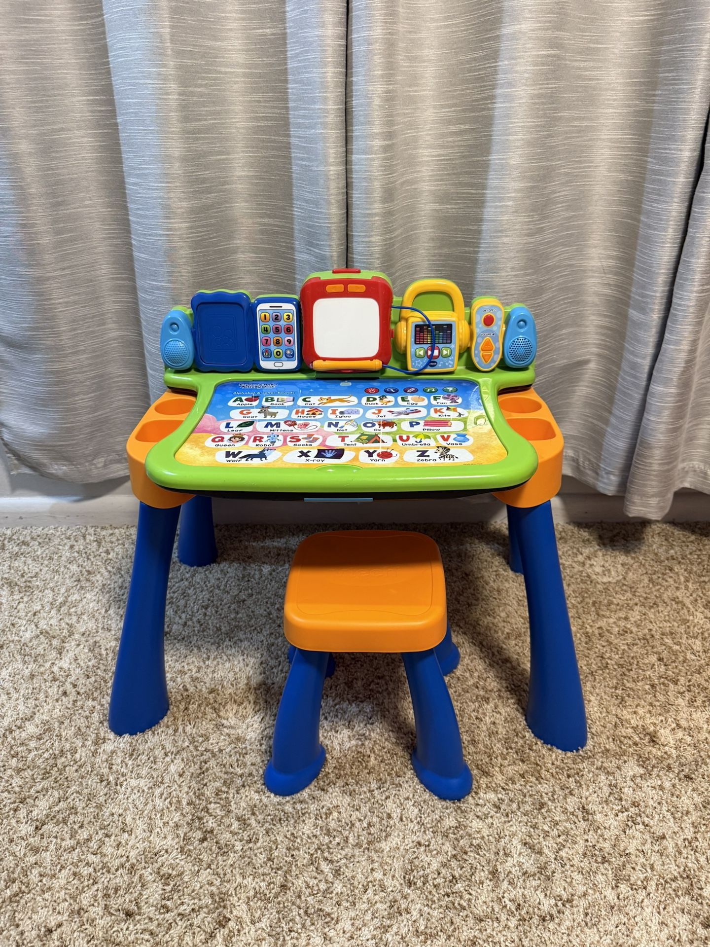 Great condition! Fun and interactive learning desk for toddlers. Features alphabet board, pretend phone, music player, writing board, and multiple flip-open activities. Bright colors, sturdy, and easy to clean. Perfect for teaching letters and keeping little ones entertained. Pet friendly/Smoke-free home. Pick up only