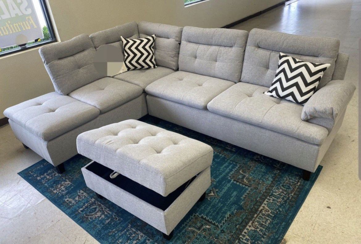 Brand new light grey linen Sectional Sofa with storage ottoman and 2 accent pillows. Comes new in 3 boxes. Assembly required. Left facing chaise. 77 x 105 x 37h. Delivery π for additional fee. Firm price