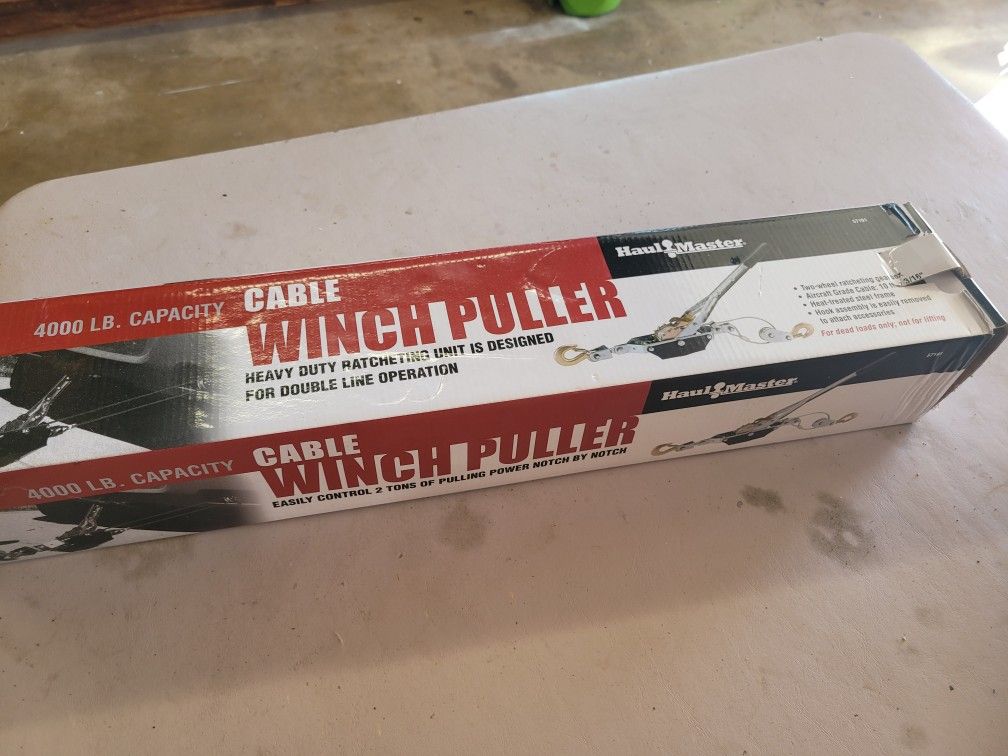 Brand new Haul-Master cable winch puller rated at 4,000 lb capacity. Heavy-duty ratcheting design for pulling vehicles, fence posts, logs, equipment, and other heavy loads. Designed for double-line operation and controlled pulling — great for off-road, recovery, farm, or construction use. ✅ New in box ✅ 4,000 lb pulling capacity ✅ Steel cable & hooks ✅ Manual ratcheting (no power needed) For pulling only — not for overhead lifting. Local pickup. Cash preferred.