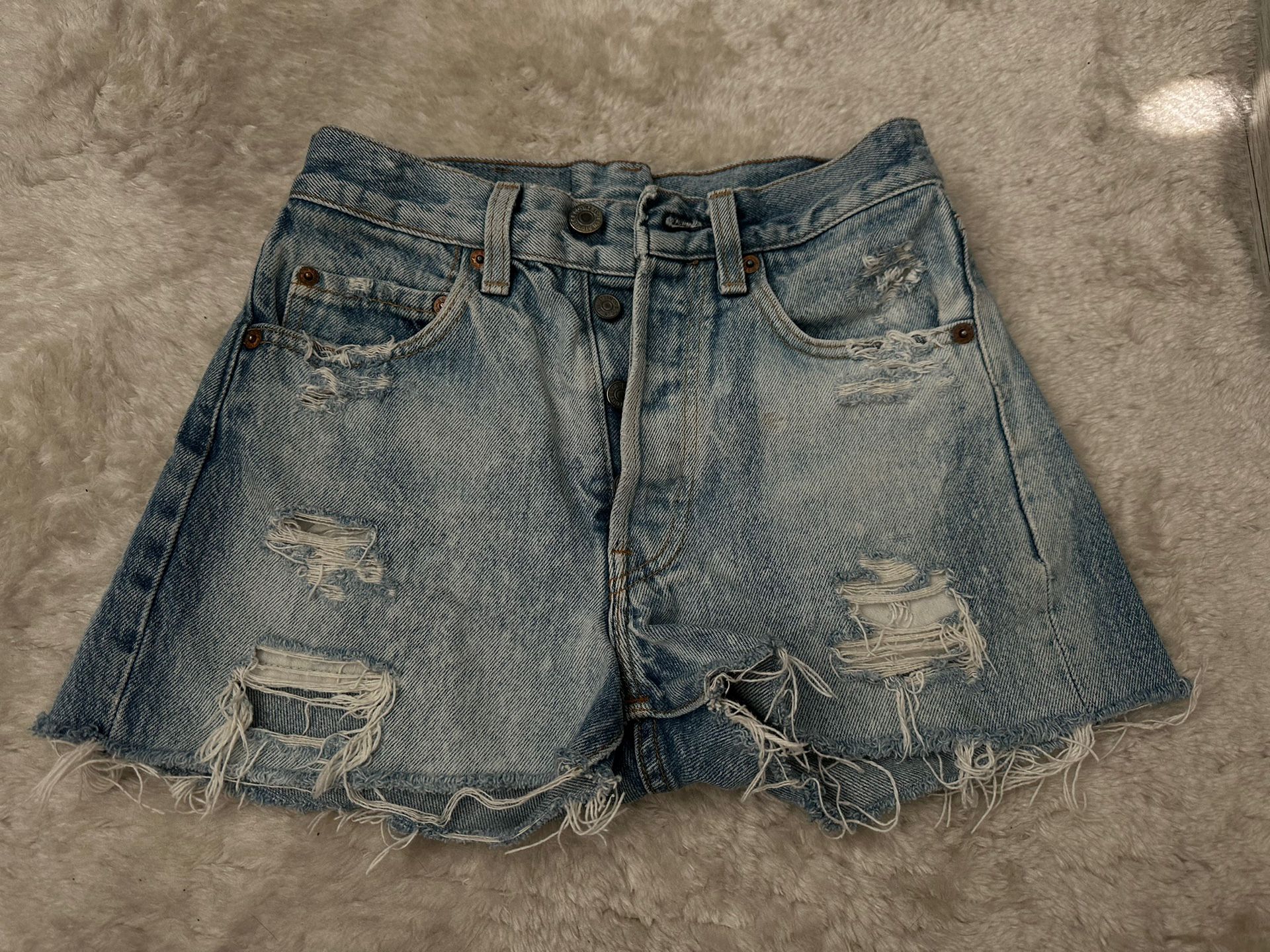 Size 26 Levi’s denim shorts. Distressed/ vintage look, medium-light wash denim, short length, full button fly.