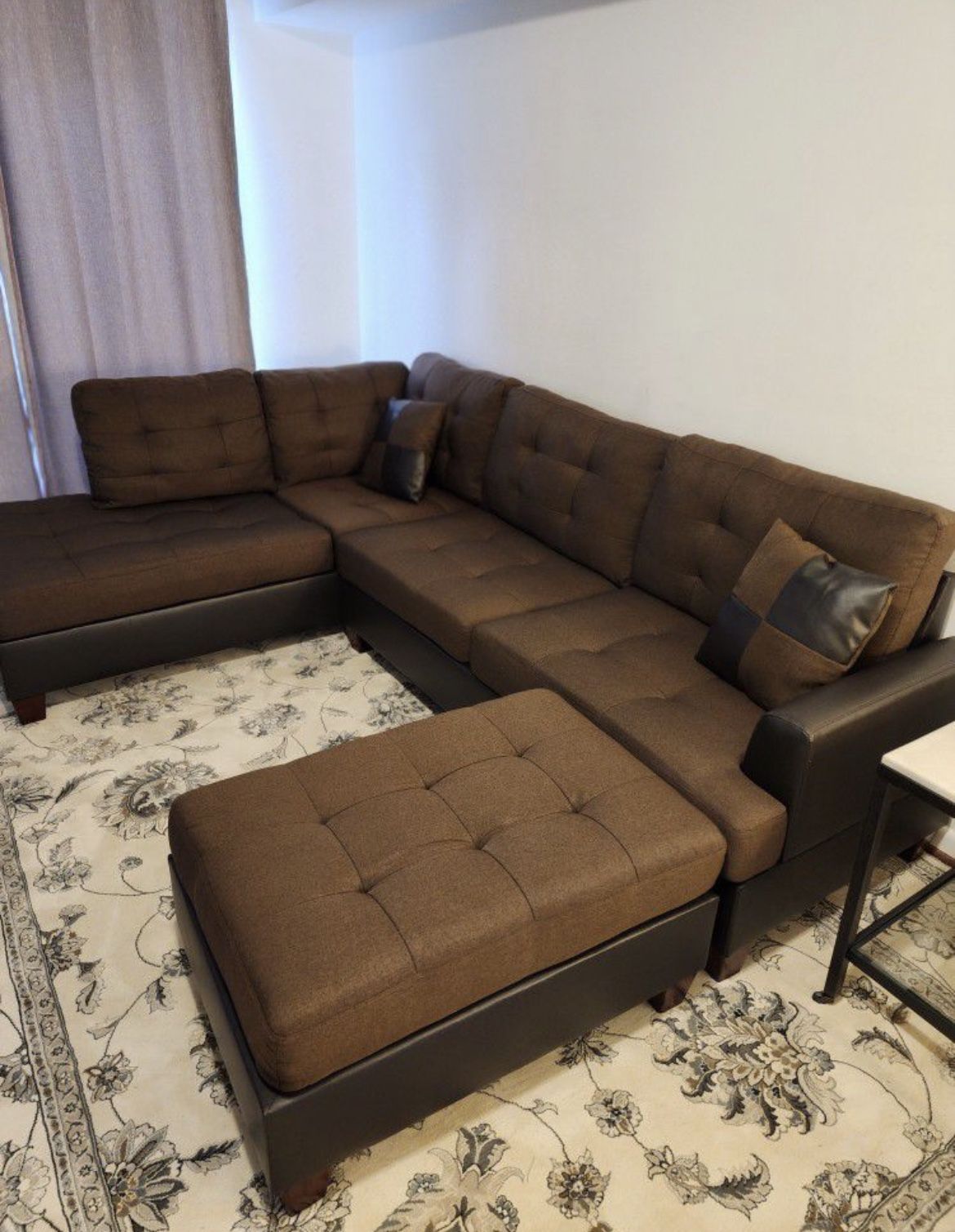 New in 3 boxes Brown linen fabric Sectional sofa with reversible chaise and ottoman. Sectional measures 104”x75”x35”H Delivery available for additional fee depending on your location