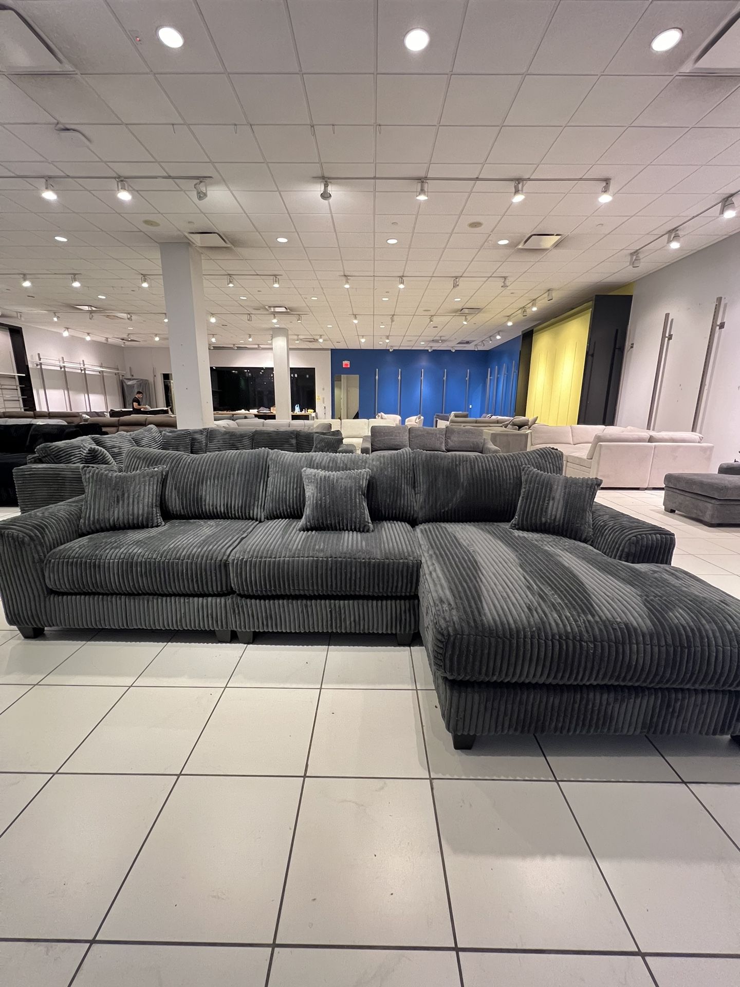 Made in NC ๐บ๐ธ and designed for ultimate comfort, this oversized corduroy sectional spans 140โ with an extra-wide chaise. Enjoy the super soft fabric and thick, cozy cushions built on a solid wood frame. Cushions are double sided and not attached, can be reversed (Accidents happen!) Versatile and stylish, itโs modular, so you can easily remove a seat if needed. Plus, it comes with 3 free reversible throw pillows for added flair! ๐๏ธโจ Fraction of the cost of other retailers ๐ AVAILABLE IN BLACK ๐ค & DARK GRAY ๐ฉถ -$1499 FLAT out the door price!- Payment accepted ONLY after delivery ๐ ๐ FREE 24Hr DELIVERY & ASSEMBLY ๐ง ๐ฒNo credit financing options available๐ฒ Dimensions: 140โ x 70โ Would you like to see the set before purchasing? We do video call showings or in person showings by appointments at our warehouses ๐
