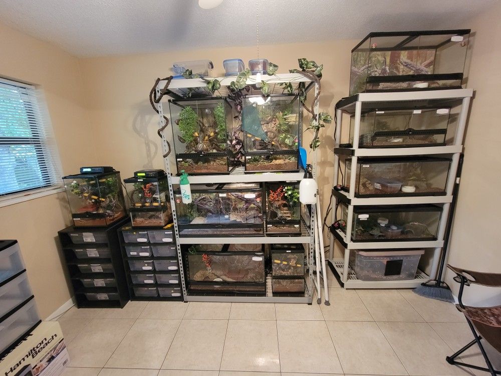 Ex reptile keeper selling off his cages and equipment including 2 C Serpent racks with internal heating, temp regulators, heating pads, entire kits! Hit me up need this stuff gone ASAP, take it all and ill give u a huge discount! 1000 for EVERYTHING SMALL CAGES 45 PER MEDIUM CAGES 75 PER LARGE CAGES 100 PER C SERPENT RACKS 200 PER THERMOSTATS INCLUDED WITH RACKS! DECOR! TUBS! ID LIKE to sell this entire display collection in 1 shot. Ill help you load it up! 4 best in the world genetic leapord geckos! 1x Super giant female 450 1x pure Emerine 300 1x Firebold female 550 1x 100% Electric! SUPER RARE! 600 Breeder? Making your reptile loving kids dream come true with his own setup? MAKE AN OFFER!