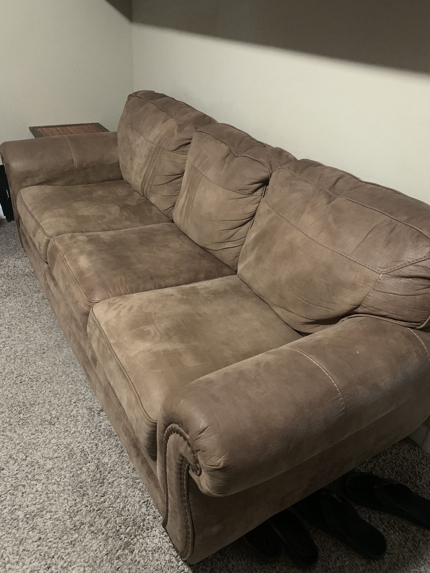 A sofa and loveseat, faux leather, soft like suede. Full size couch has pull out Queen foam mattress, used once or twice. Pet free home. Some use but in good shape.