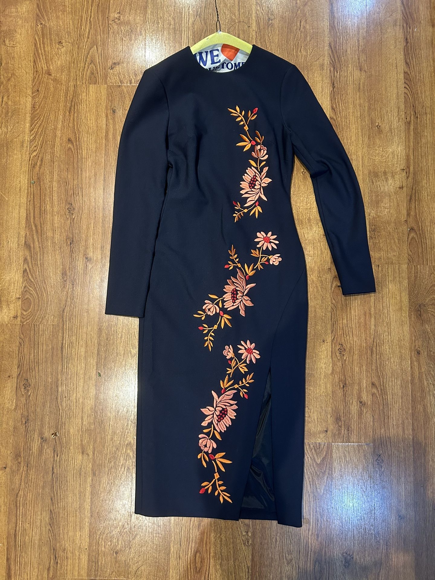 fully lined embroidered floral design in orange hues back hidden zipper worn once and dry cleaned