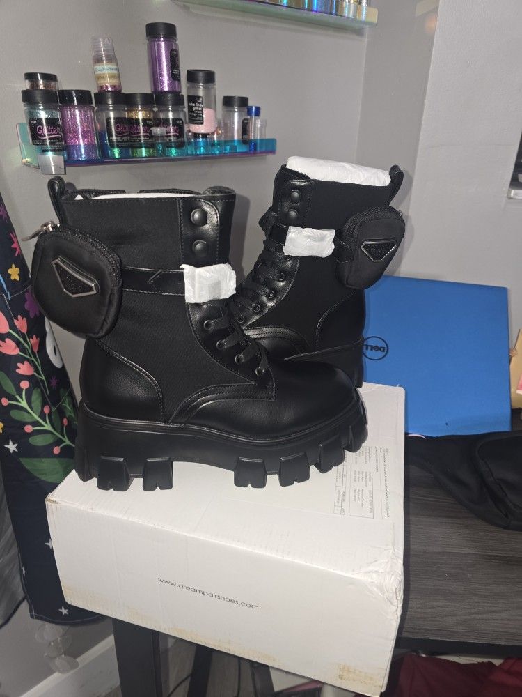 Black Fashion Lace Up Combat Boots With Pouch New W/Box These are brand new. Have never been worn. Super cool and trendy. Pouches are on a removable strap with buckle soo it can be worn with or without the pouches attached always