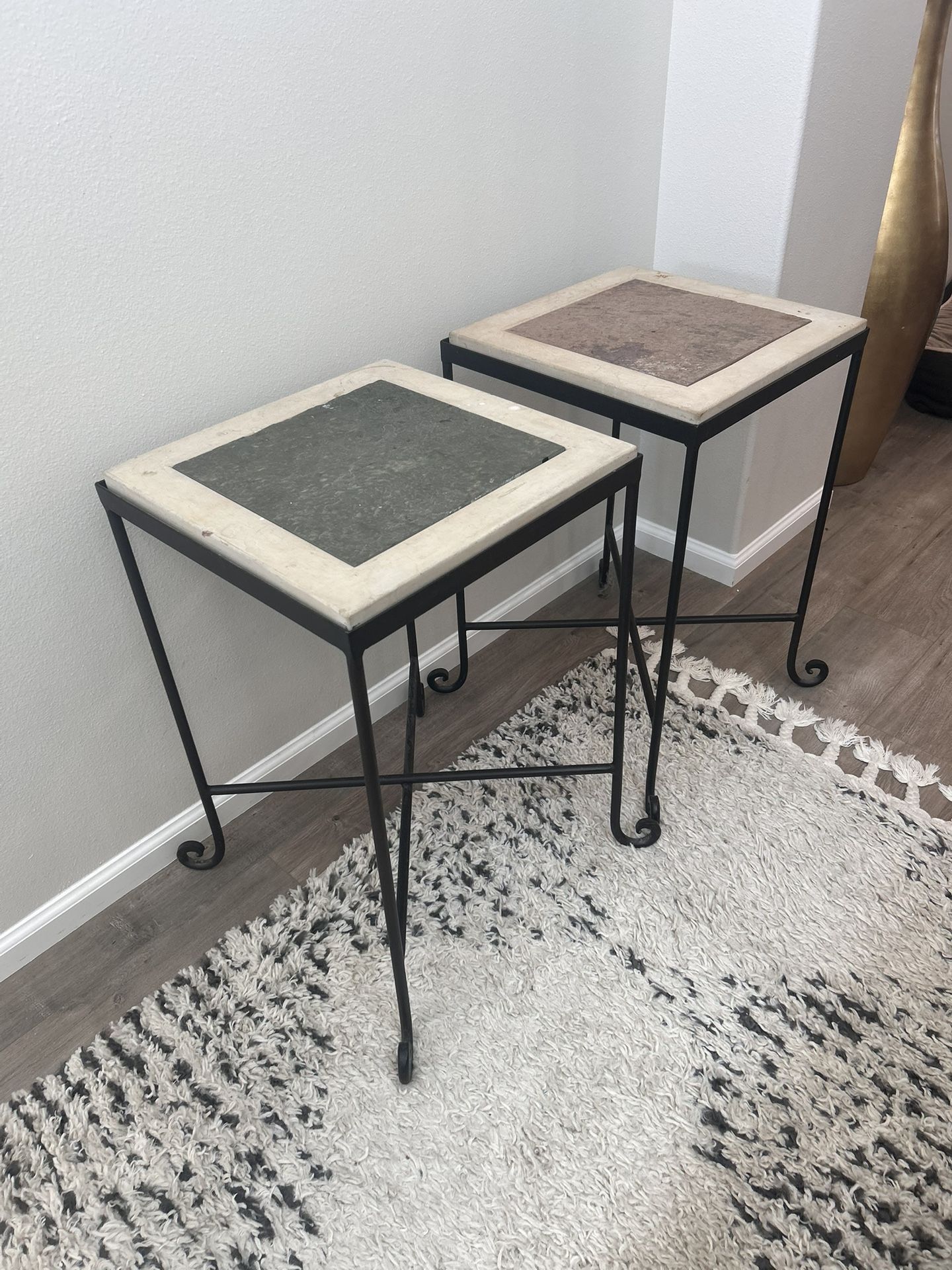 Heavy rod iron end tables with stone top. Dimensions: 23-1/2 H x 14-3/4 W Sold separately at $30 a piece or as a set at $50 total