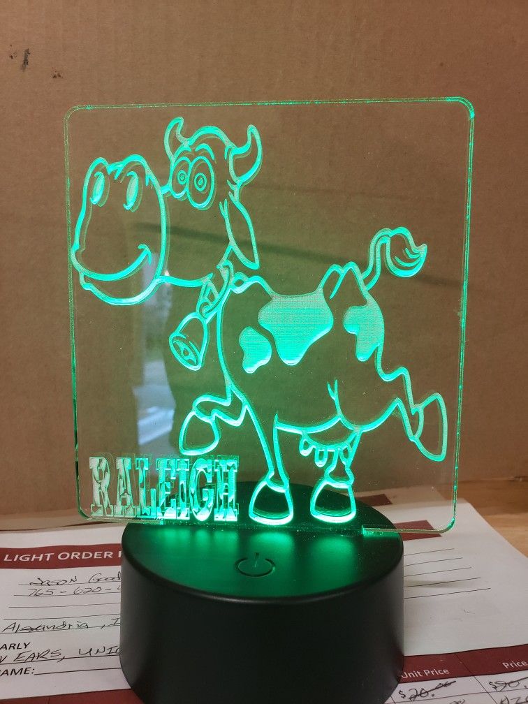 5x6 in acrilic light, can customize names, logos ect, multi color Led base, USB cord, requires USB plug, or AA batteries to operate.