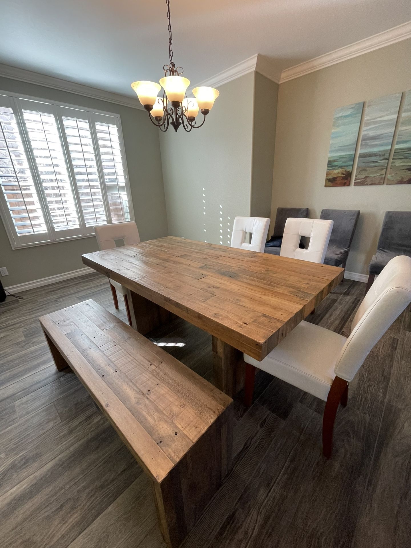 Gently used West Elm dining table and bench. 72in table and 58in bench. Paid over $2000. Can deliver for free in San Diego. Let me know if you’re also interested in the 4 white dining chairs in the picture.
