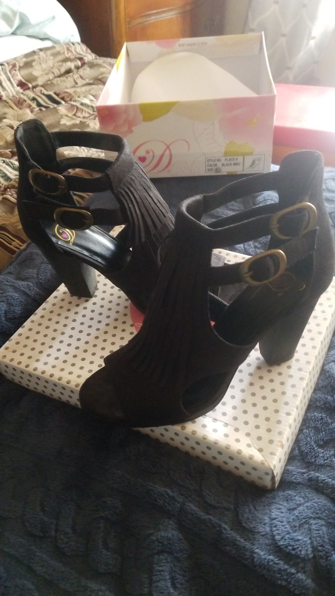 Size 6.5 Nice fringe black suede. I also have in cognac color see offers. Trades good.