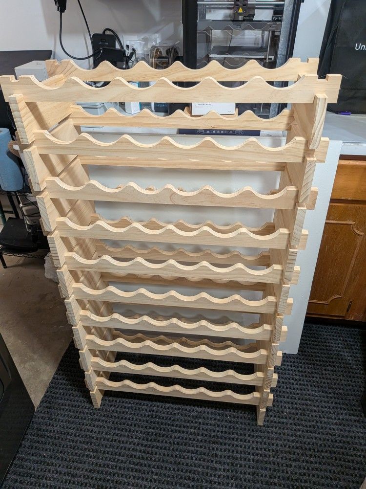 Collapsible. Raw wood. Comes with ~20 empty wine bottles for home brew.
