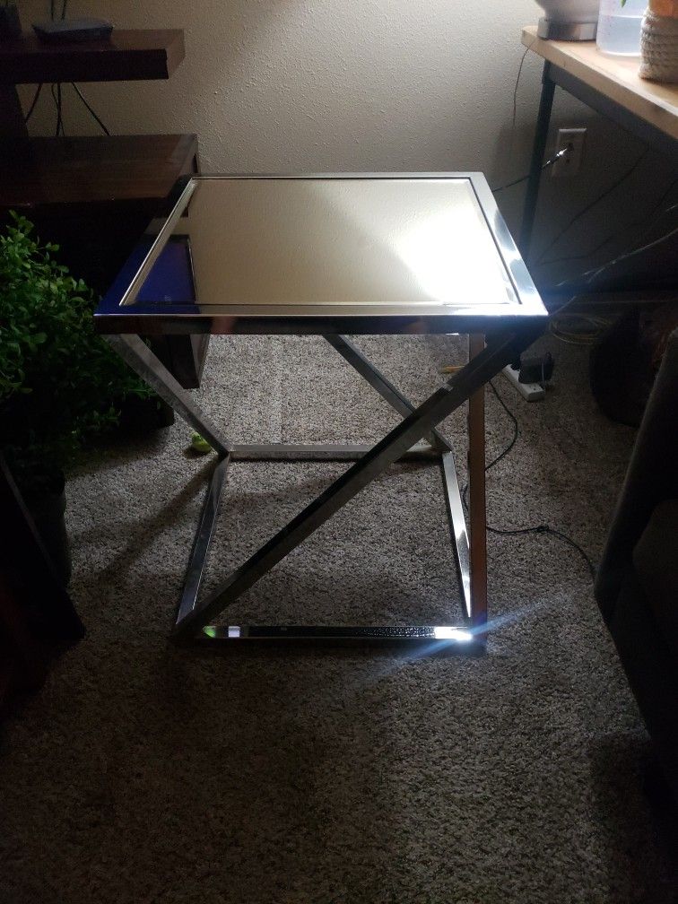 Gorgeous end table. Could be used as a sofa table, coffee table or bedside table. Mirror top with chrome detailing. Lamp in picture $50 extra. Midcentury modern and sleek. OFFERS WELCOME