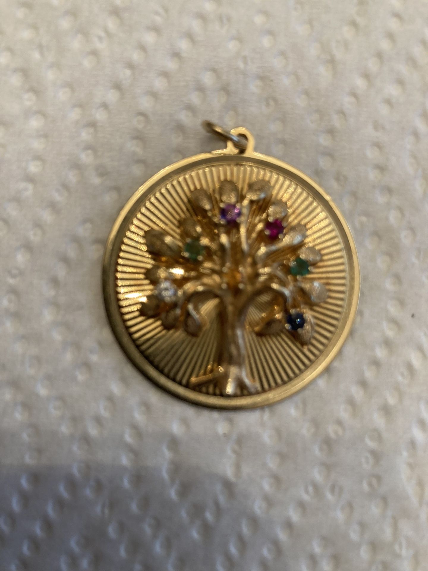 7 gems diamond, emerald, amethyst, ruby, emerald, sapphire, and orange topaz. Weighs 9.9 grams custom made by Henry Dankner. Copyright. First letter of each gem Spells Dearest.