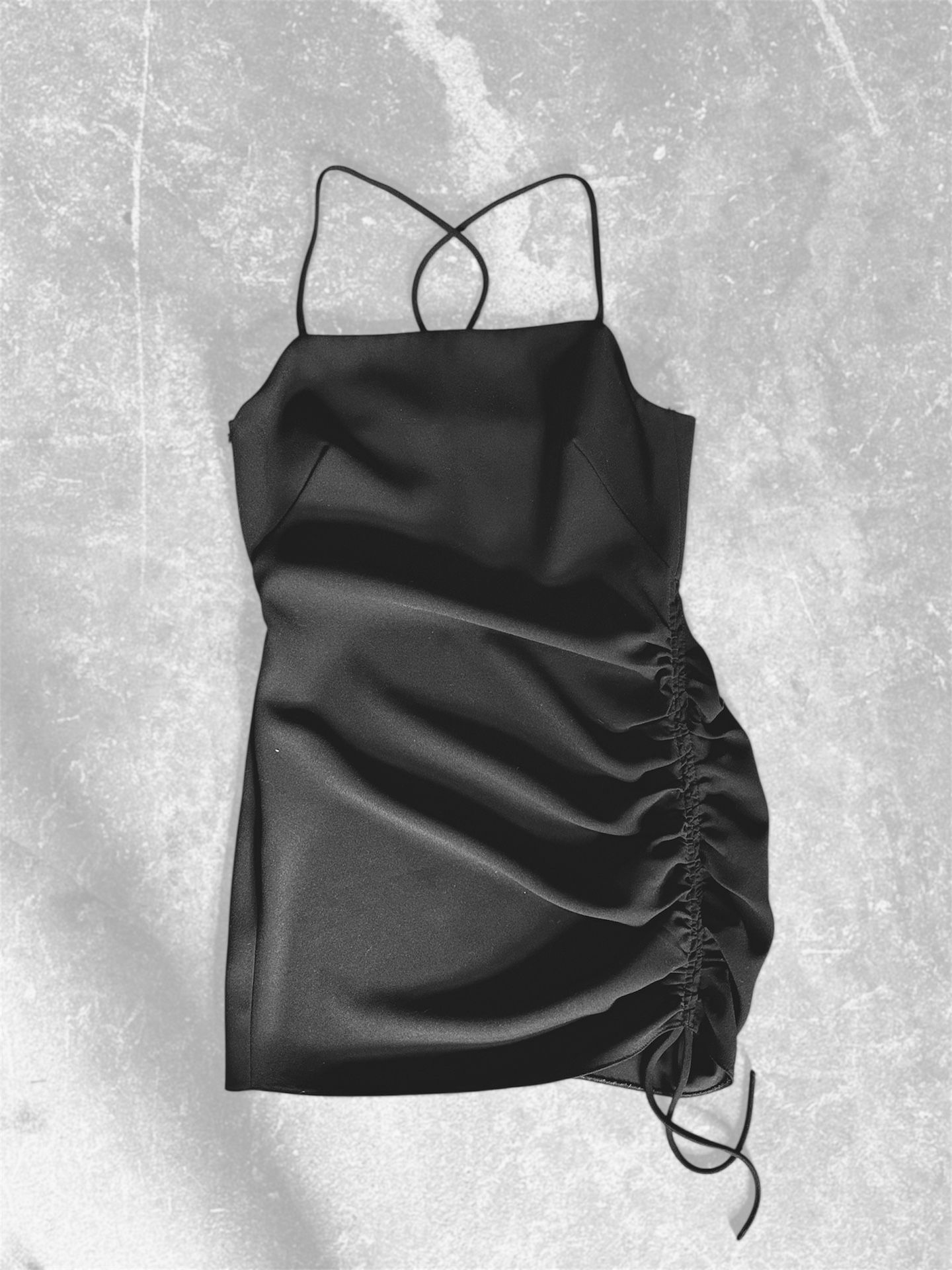 ZARA Spaghetti Strap Ruched Mini Dress in black.