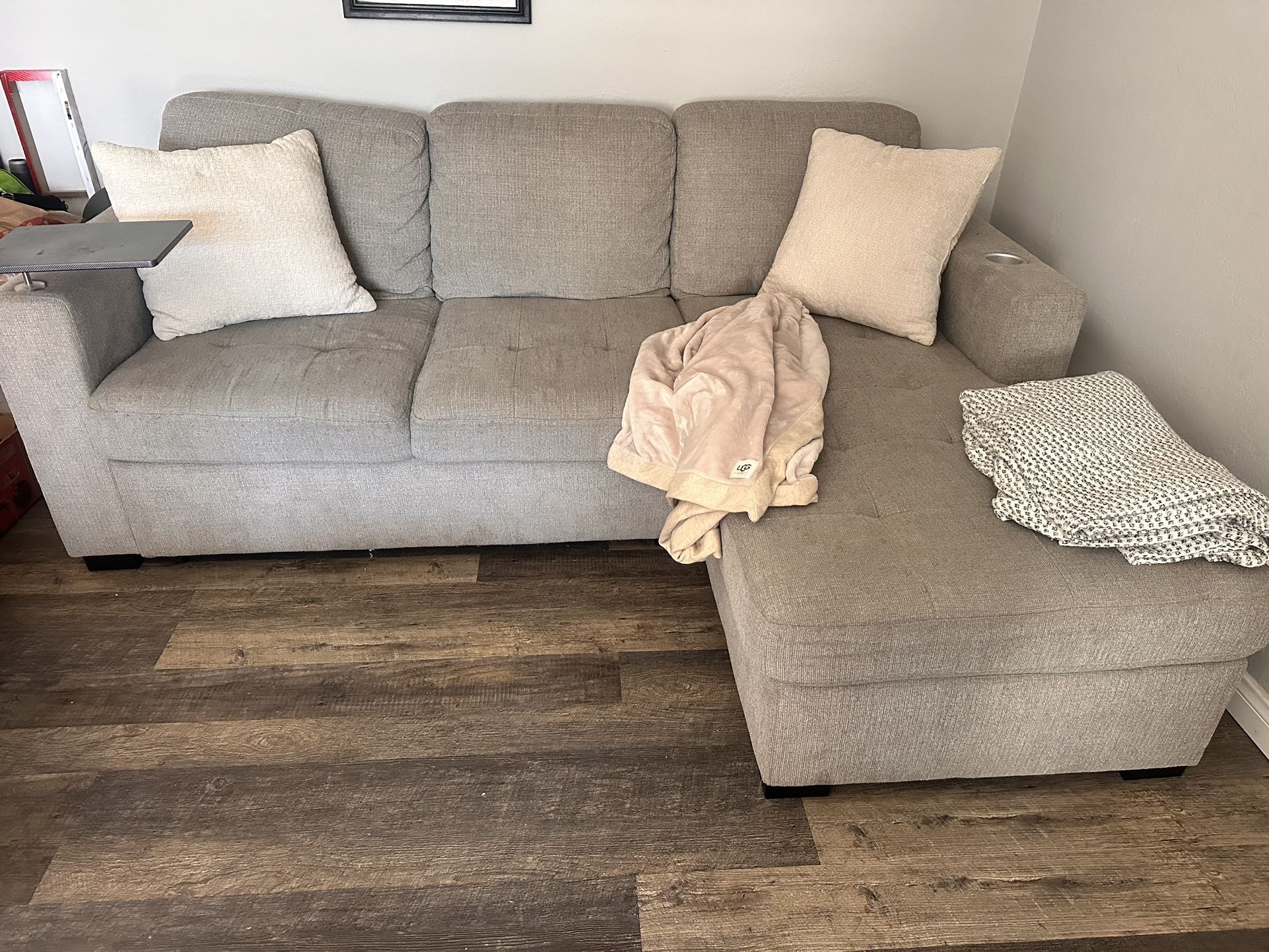 L-shaped sectional 87 inches in length 64 inches wide- bought it from mor furniture warehouse. Has a compartment that has a USB plugs- extra compartment for storage. Also a hideaway bed. Retails 799.99. Give me your best offer, but keep it a fair price.ive kept it very nice. I will be cleaning it and prepping it for sale. No tears, no stains.