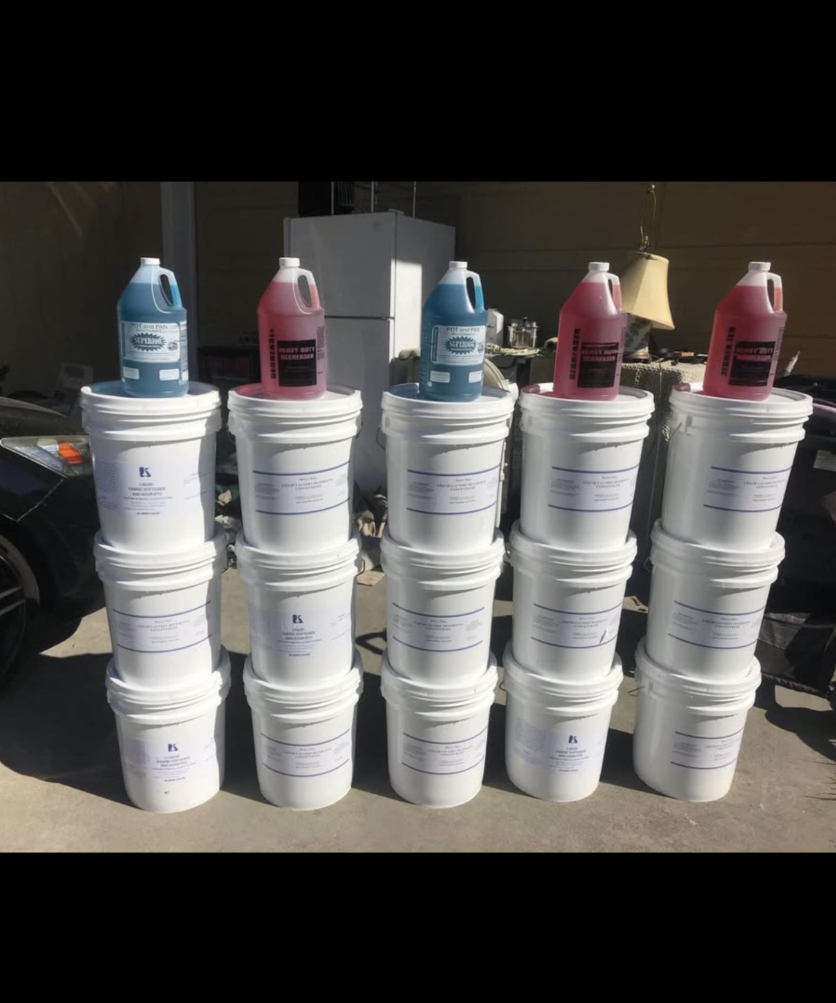 128oz Heavy duty Degreaser -$15 128oz dish soap - $12 5 gal fabric softener - $50 5 gal laundry detergent - $50