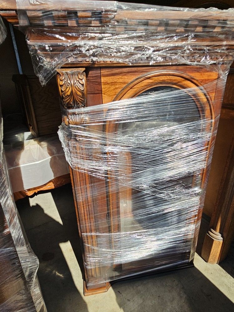 Left and right side cabinets. Each side has a bottom and top. Beautiful woodwork. Top piece is 56" and bottom is 33 1/2" tall which is 89 1/2 " tall total. It is 29" wide and 32" wide at the top. From wall to front of cabinet is 22 1/2 ". Also has lights that work. 200 for both