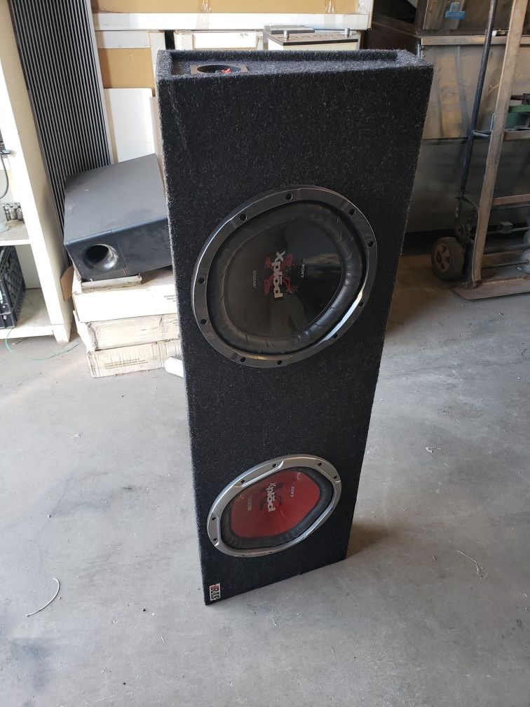 Car Subwoofer speaker Box With 2 12" speakers Sony explod 1200 watts Box is 16" tall 8" deep 48" wide