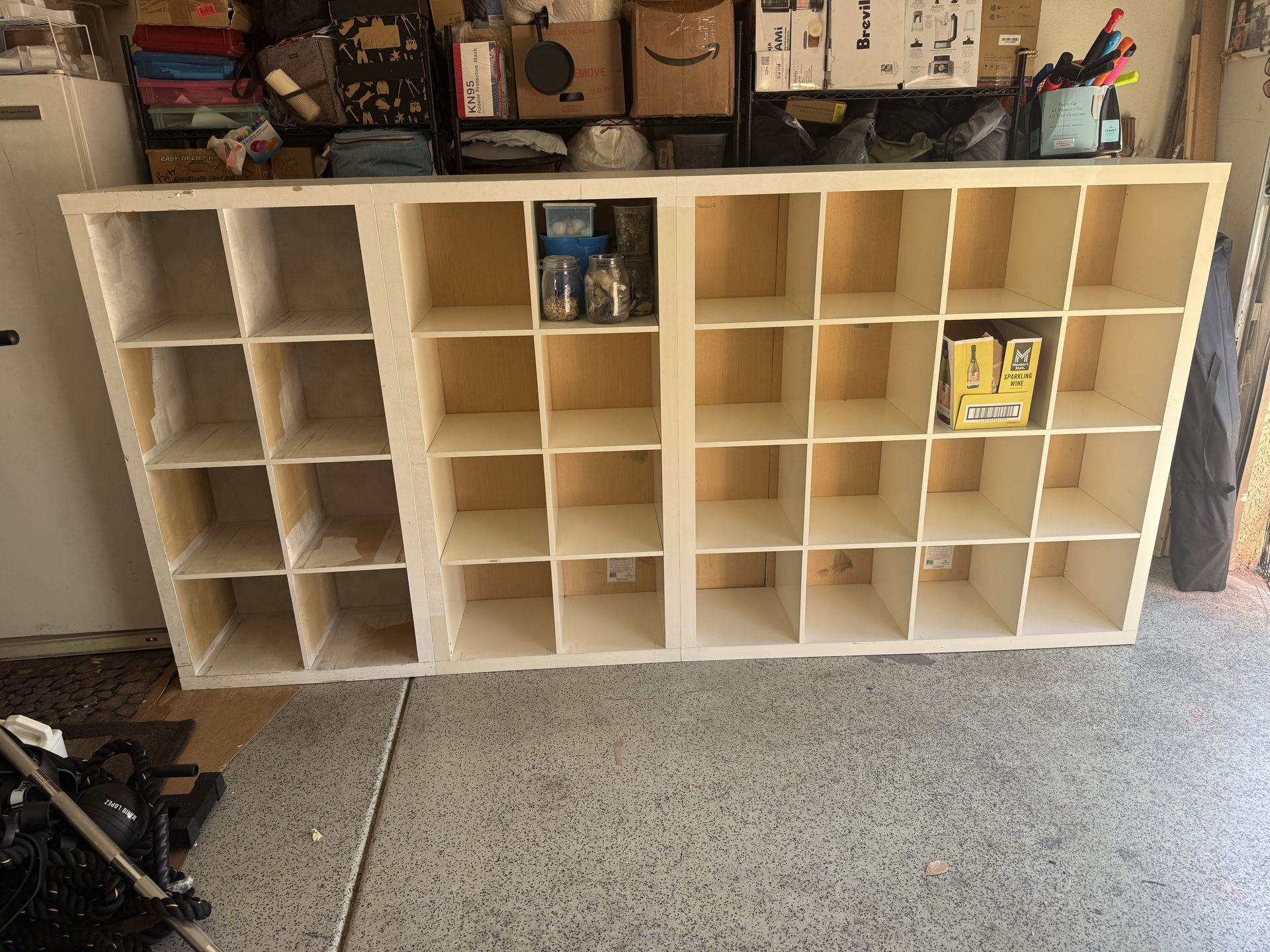 IKEA KALLAX cube shelf $80 for the 3 or $40 for the 16 cube $30 for the 8 cube This is in my garage. I used it for storage it’s not so pretty but it’s solid. There is a particle board, nailed to the back to hold it together as one solid piece, but it comes apart into three.