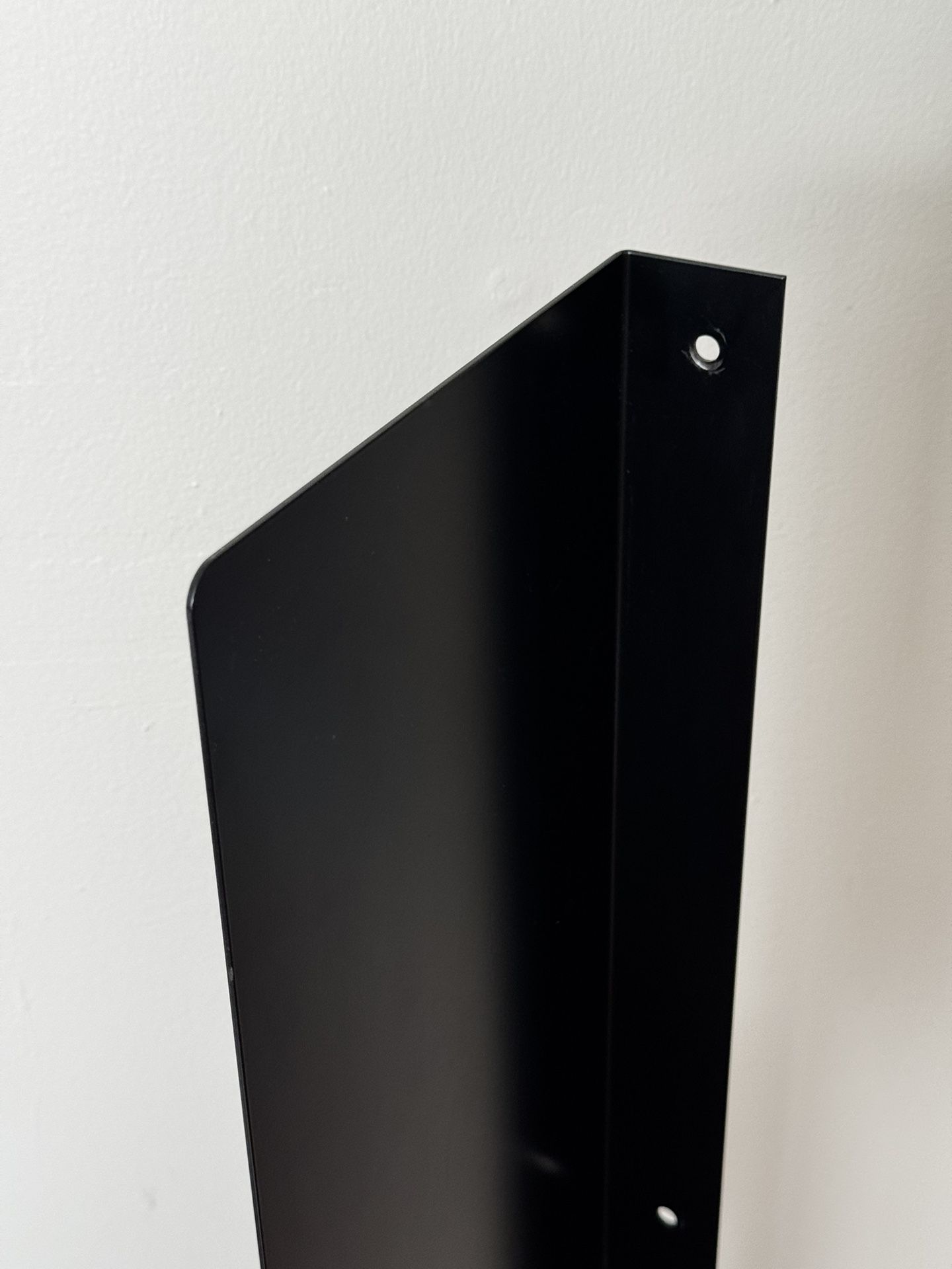 Electroplated black, has wear marks in paint. Sturdy and heavy duty. Includes matching hardware for wood and anchors. Made in USA Measures 46”x 8.5”