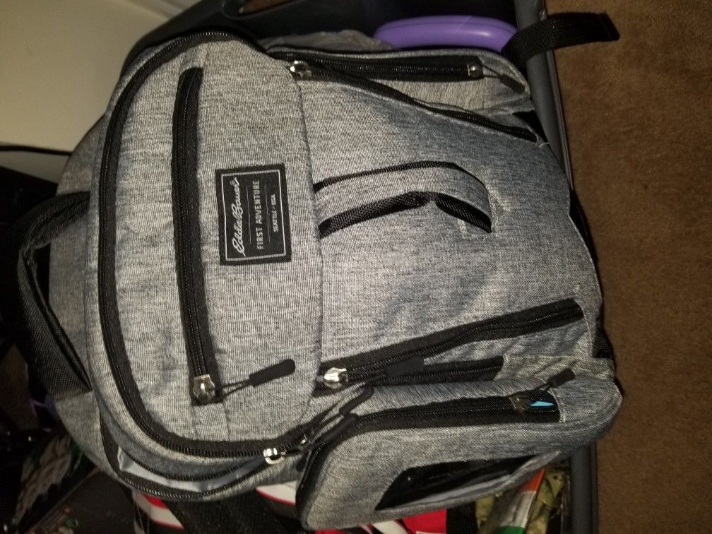 Grey Used about 3 times. Still looks brand new. Comes with wipe case also. Has changing table pad and a clear little bag attached inside. It has an insulated pocket on the side to keep bottles (it can hold 2 dr brown 8oz bottles) Smoke free home.