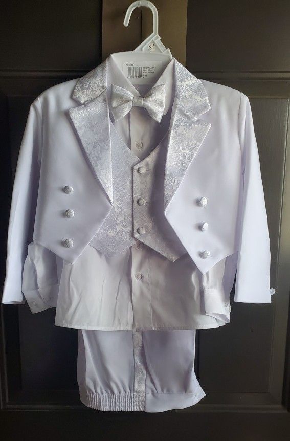 SIZE 5 BOY'S BAPTISM 4-PIECE TUXEDO WITH EXTRA BUTTONS. (I PAID $87). WAS WORN LESS THAN AN HOUR. LIKE NEW, HAVE THEEXTRA BUTTONS. BEAUTIFULLY EMBROIDERED. 1. WHITE DRESS SHIRT 2. WHITE PANTS WITH SATIN VERTICAL WHITE STRIPE DESIGN, WITH ELASTIC IN WAIST. 3. WHITE VEST WITH SATIN WHITE DESIGN 4. LONG TAIL TUXEDO JACKET WITH SATIN WHITE DESIGN & VIRGIN DE GUADALUPE EMBROIDERED ON BACK. HAVE EXTRA 3 EXTRA BUTTONS, ALSO. ASKING $65, PRICE FIRM. CASH ONLY. FROM NON SMOKING HOME.