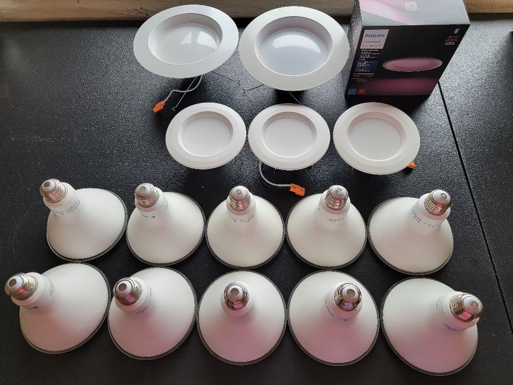 Upgrading many of my home lights to smart lights. I have one brand new smart 4" Hue Color Recessed Downlight (never been opened; cost me $65/light). I purchased pack of 4, but only have 3 fixtures. The rest of the lights are not smart but include three Recessed Downlight 4", two 6" Recessed Downlight, and 12 flood lights. All in perfect working order.