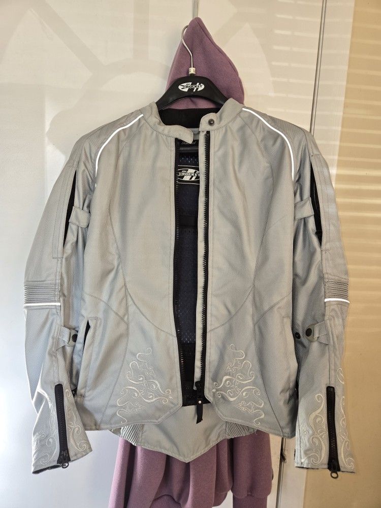 This is a like new, "Joe Rocket" women's large motorcycle jacket . Only worn twice, and still has extra buttons. Plenty of vent zippers and protection pads! It's a tad bit too small for us, and it needs to go. Located in Stafford Va., but can ship if needed! Asking $45 obo, no trades or scams please.