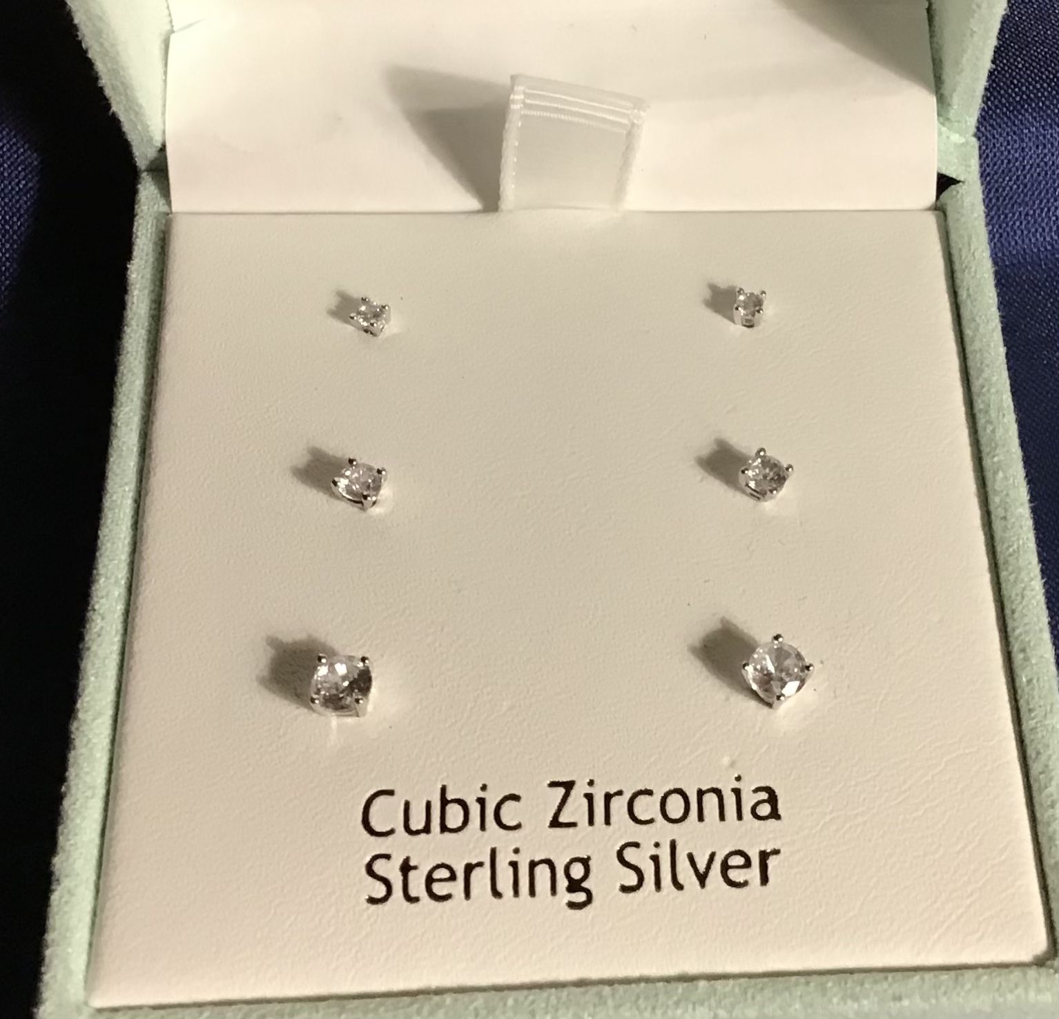3 sets of tiny cubic zirconia earrings. Largest is about 1/4 carat. Sterling silver setting /post.