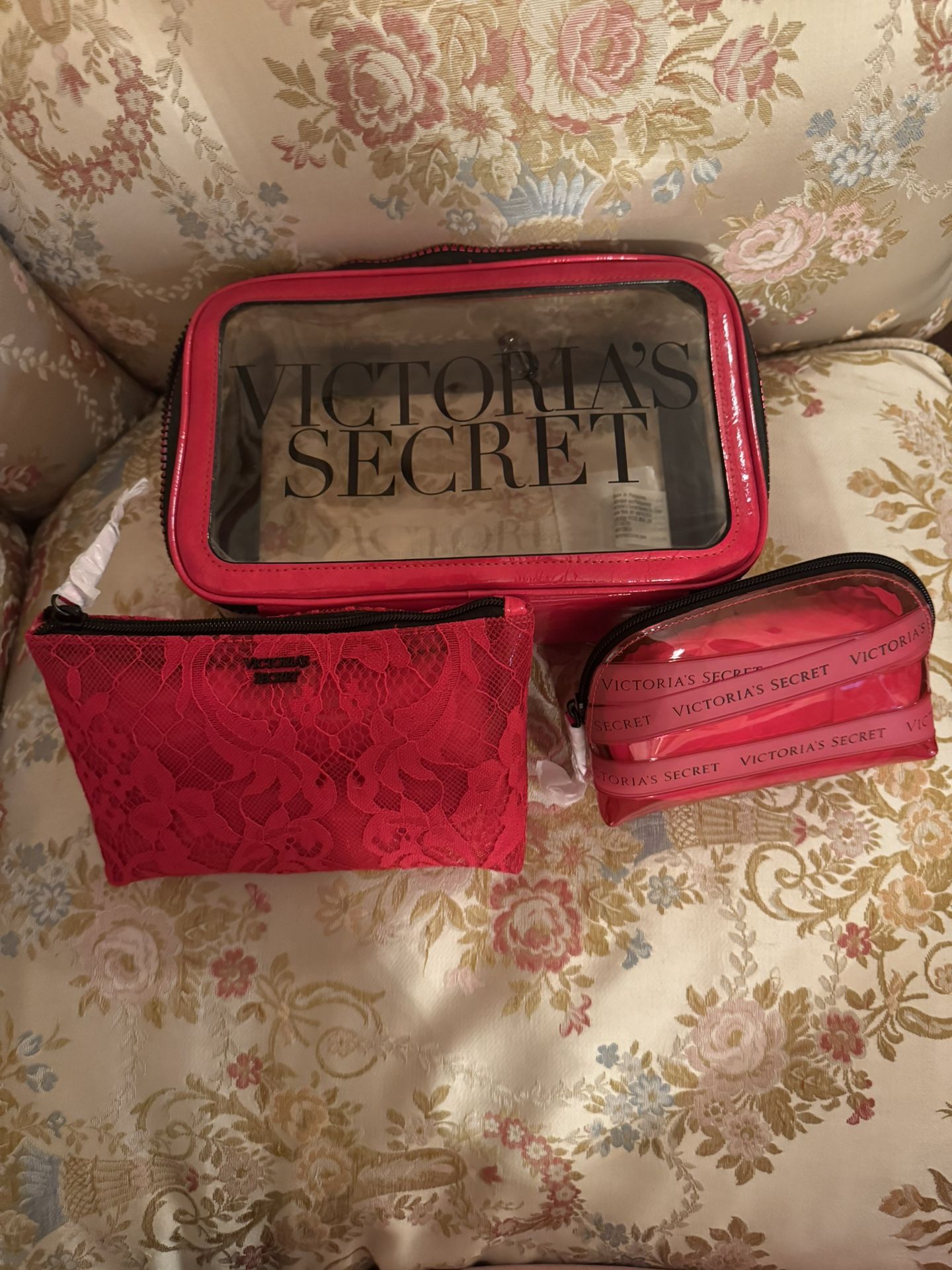 New with tags, red see-trough Victoria’s Secret 3pc travel set, makeup set