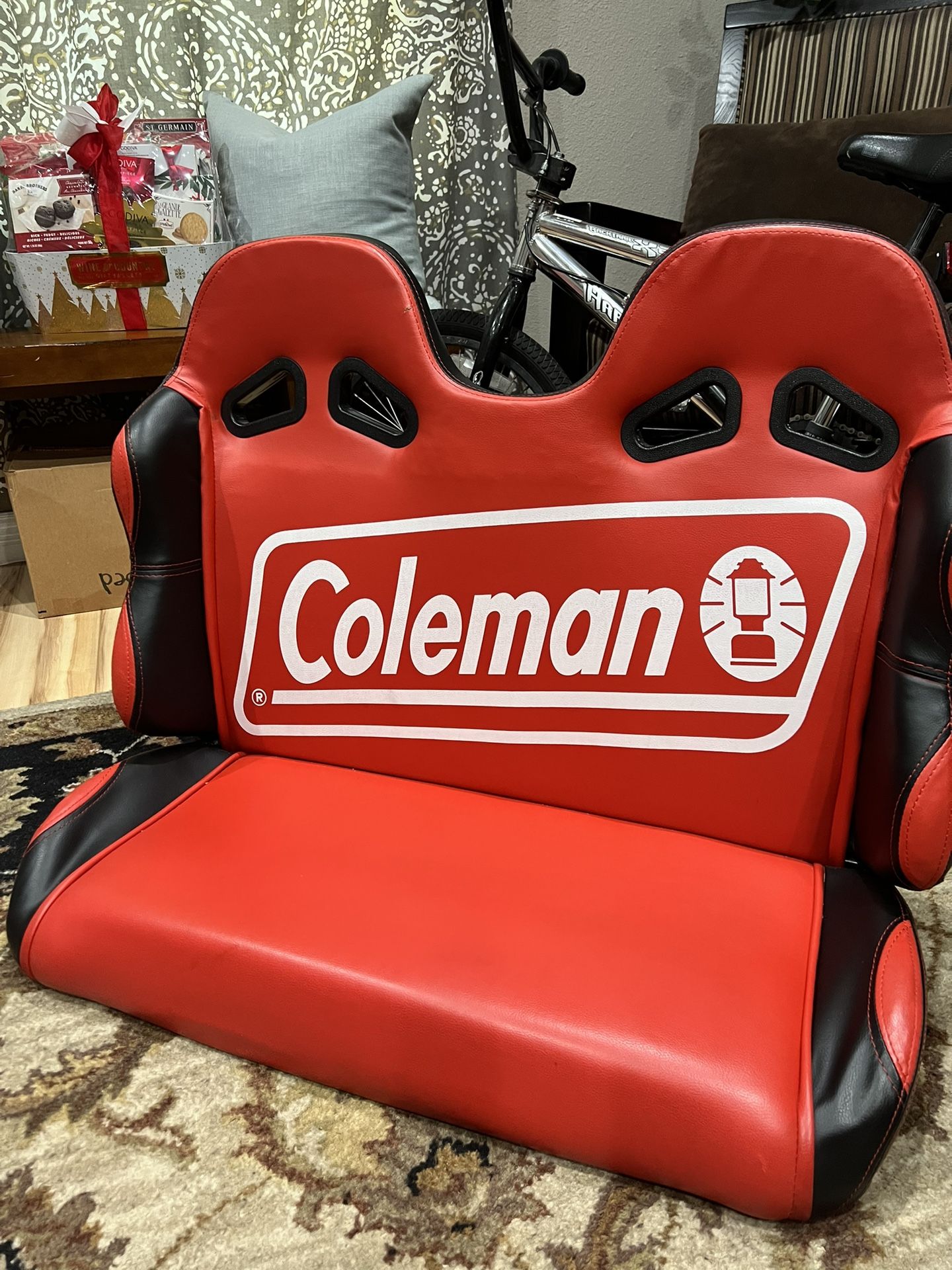 Coleman Leather seat for a child Measures; ( 31” L x 13” W x 24” H) 2 small children can sit comfortably Was used in child’s room, never used outside A small tare on leather on headrest area. Very well kept and used minimally Pick up only in south San Jose by Cottle rd x Santa Teresa (mornings -2 pm only please or after 9pm) Cash or Zelle $60 (After searching for similar seats, I realized it’s a go-kart seat for a child’s kart. I always used it as a seat in my child’s playroom. It goes for ~$200 )