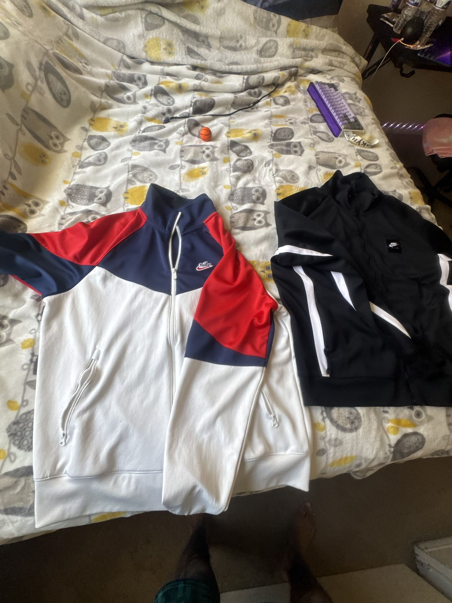 2 nike turtle necks and black valabasas pants and a red nike duffle bag