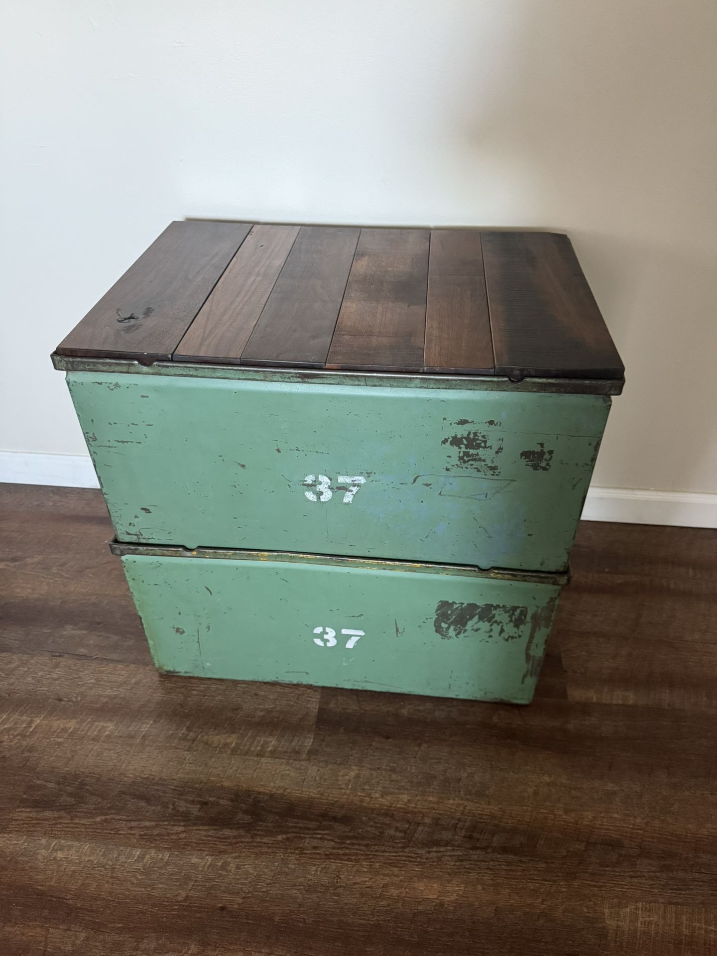 These vintage military cargo boxes have been repurposed in to a one of a kind end table with a hardwood top that conceals storage underneath. The institutional green has a striking patina with bits of old paint colors showing through. 24.5” L x 17” D x 24.5” H