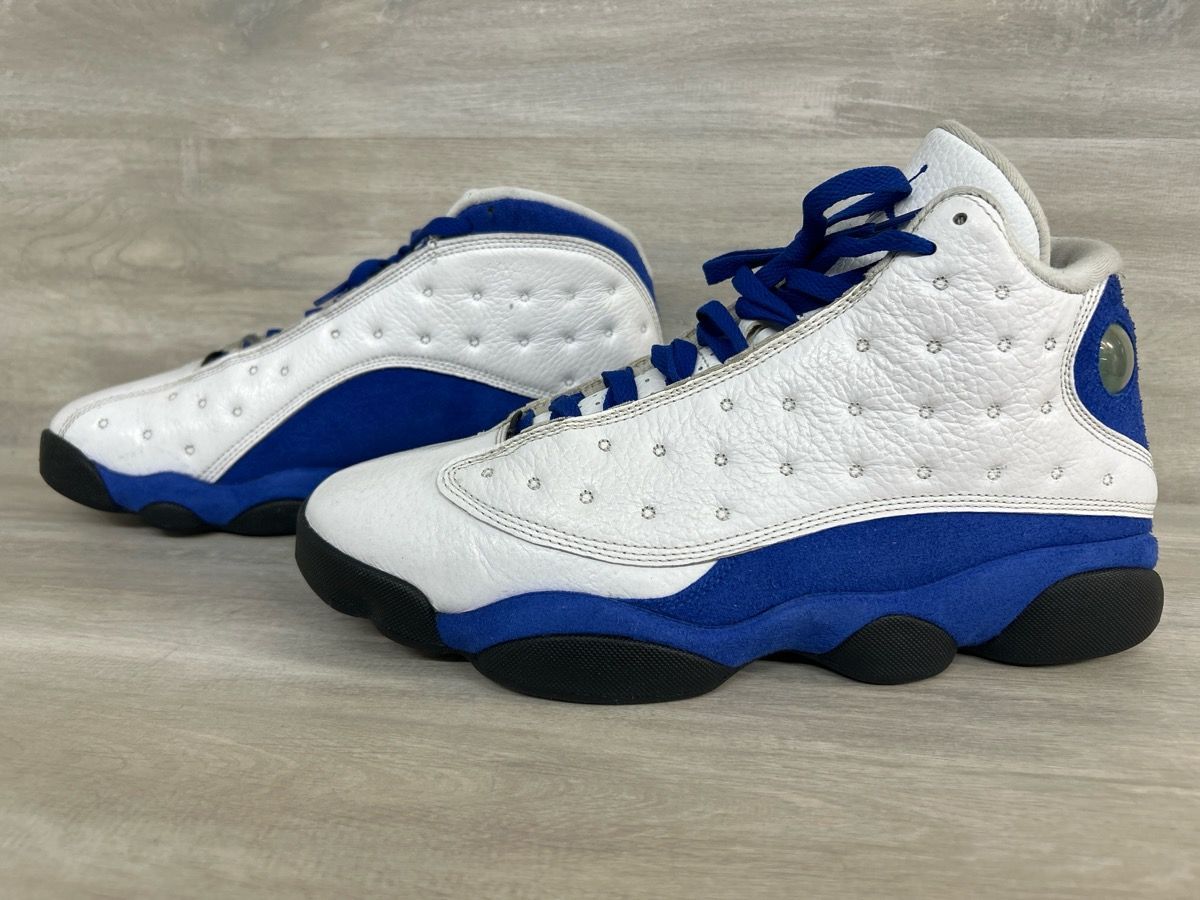 Jordan 13 Retro "White/Hyper Royal/Black" sneakers, size 11. This athletic sneaker features a leather upper, signature panther-inspired outsole, and blue/white/black colorway. Pre-owned in good overall condition with standard signs of wear including minor scuffing and light creasing. No original box included. Style Code: 414571-117 Color: Blue/White/Black Material: Leather Width: Medium (D, M) 100% authentic. Professionally packed and ready to ship. Call 503-206-4540 for questions. Layaway and nationwide shipping available.