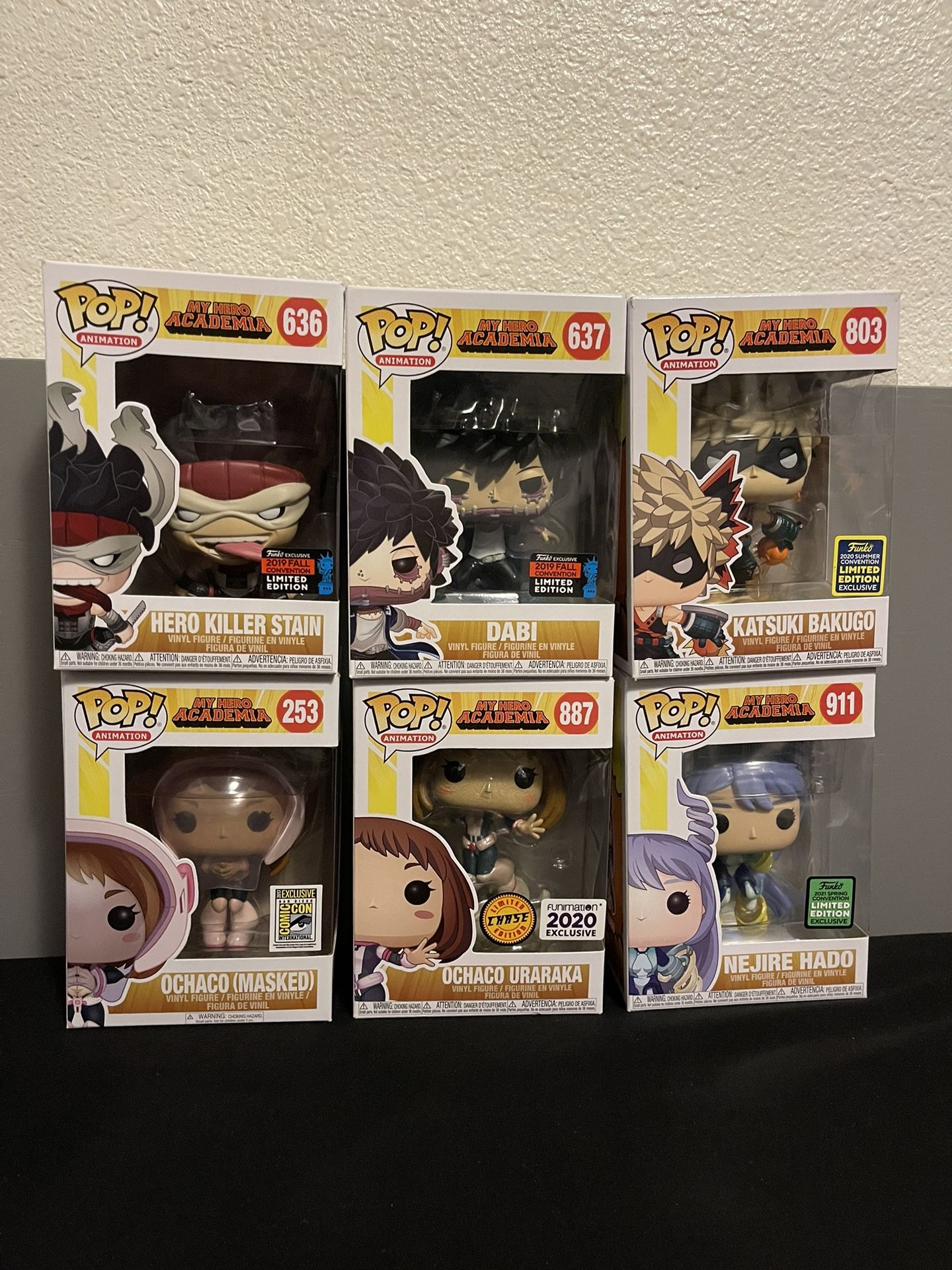 Different prices or best offers. Let me know which ones you are interested in. Will trade for other funkos (mainly looking for Five Nights at Freddy) and one piece cards (local only) Ochaco Con $200 Ochaco chase $100 Nejire $110 Bakugo $50 Dabi Sold Hero Killer $50 Pick up only Can ship Funko Pop Grails, Anime, One piece, Sword Art Online, Naruto, Dragon Ball, Bleach, Tokyo Ghoul, Demon Slayer, Attack on Titan, My Hero Academia, Hunter x Hunter, Cow Boy bepop, Death Note, Fire Force, Evengelion, Seraph of the End, The Last of Us, Stranger Things, Breaking Bad, WWE, GI Joe, brook shared, Funko chase.