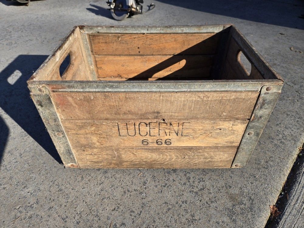 Vintage Lucerne 1966 Wooden Crate, Steel Frame Dairy Milk Beverage Delivery, 19x13", 10.5" tall Cash only. Please click for other items I'm selling. Bundle pricing.
