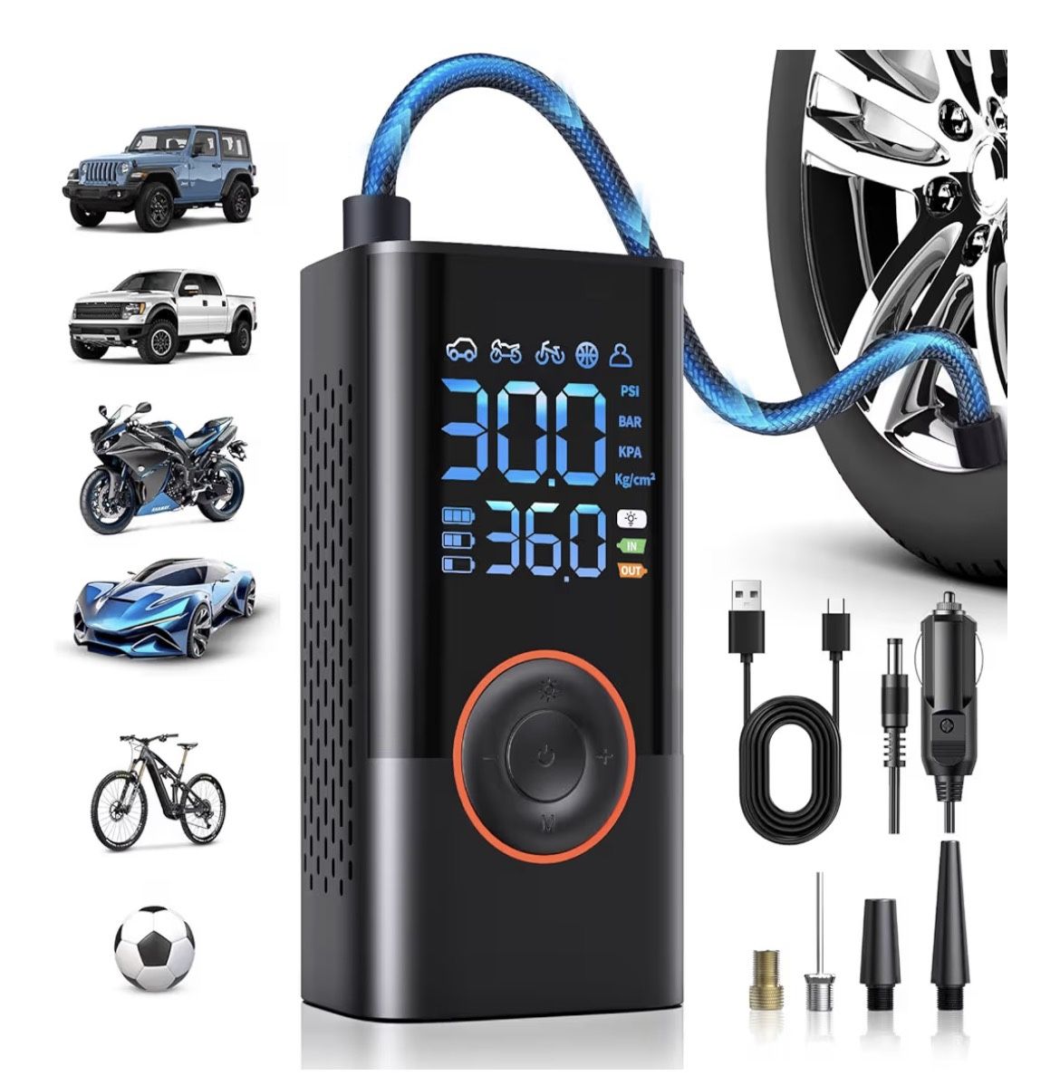 Brand: QYQBOON Tire Inflator Portable Air Compressor Portable Cordless Mini Air Pump with Digital Pressure Gauge Inflater 150PSI 3X Fast Inflation Auto Shutoff Large Battery Tires Pump for Cars Motors Bikes Balls Brand new. Never been used. Still in the box. Brand QYQBOON Voltage 7.4 Volts Recommended Uses For Product Tire Inflation Power Source Battery Powered Special Feature 12V DC Adaptable, โAutomatic Shut-Off, Digital, Portable Included Components Atmospheric nozzle*1, Small-caliber mouthpiece*1, French adapter*1, Tire inflator*1,Connecting air tube*1๏ผ12V DC car power cord*1, Type-C charging cable*1, User manual*1Atmospheric nozzle*1, Small-caliber mouthpiece*1, French adapter*1, Tire inflator*1,Connecting air tuโฆ See more ๐ใ๐๐๐ฎ๐น ๐๐ป๐ณ๐น๐ฎ๐๐ถ๐ผ๐ป ๐ ๐ผ๐ฑ๐ฒ๐ โ ๐๐น๐๐ฎ๐๐ ๐ฃ๐ผ๐๐ฒ๐ฟ๐ฒ๐ฑใThis portable air compressor has a built-in high-capacity rechargeable battery and can also be powered via a 12V DC car power cord, ensuring the inflator always has a sufficient power supply. It inflates up to three times faster than other ordinary cordless inflators on the market, with 35% more power. Can inflate 7 car tires or 21 bicycle tires, away from the problem of insufficient battery power ๐ใ๐๐ฐ๐ฐ๐๐ฟ๐ฎ๐๐ฒ ๐๐๐ ๐๐ถ๐๐ฝ๐น๐ฎ๐ ๐ฎ๐ป๐ฑ ๐๐๐๐ผ๐บ๐ฎ๐๐ถ๐ฐ ๐ฆ๐๐ผ๐ฝใThe car tire air pump comes with a built-in pressure gauge and LCD screen that allows you to accurately monitor real-time tire pressure. The preset tire pressure function allows the pump to automatically shut off when the correct pressure is reached, preventing over-inflation and ensuring optimal tire performance and safety ๐ใ๐ฐ+๐ก ๐๐ป๐ณ๐น๐ฎ๐๐ถ๐ผ๐ป ๐ ๐ผ๐ฑ๐ฒ๐ใThe Air Compressor has four pressure units: PSI, KPA, BAR, KG/CMยฒ, and four preset inflation modes for bike, motorcycle, car, and ball. You can freely set the pressure of the four preset modes according to your vehicle. in addition, the fifth customized mode allows you to set the pressure value according to the inflated object to get more inflated products. You can easily switch between pressure units with just one button ๐ใ๐ ๐๐น๐๐ถ-๐ณ๐๐ป๐ฐ๐๐ถ๐ผ๐ป๐ฎ๐น ๐๐บ๐ฒ๐ฟ๐ด๐ฒ๐ป๐ฐ๐ ๐ง๐ผ๐ผ๐นใThe bicycle pump can not only be used as an air pump, it is also a multi-functional emergency tool. The flashlight on the top has 3 modes (flashlight, SOS, and strobe light) to light up the night for easy operation. The air compressor is equipped with USB-C and USB input/output ports to provide backup power for your cell phone and other electronic devices ๐ใ๐ฃ๐ผ๐๐ฒ๐ฟ๐ณ๐๐น ๐ฎ๐ป๐ฑ ๐๐ฎ๐๐ใFor fast inflation, the compressor has a maximum pressure of plus 35L/min airflow, which increases the inflation speed by 1-1.5 times, it can inflate 195/65R15 tires from 29 PSI to 35 PSI in less than 5minutes. Ideal for car, bike, and motorcycle tires ๐ใ๐ฃ๐ฎ๐ฐ๐ธ๐ฎ๐ด๐ฒ ๐๐ผ๐ป๐๐ฒ๐ป๐๐ใIncludes various accessories: tire inflator *1, connecting air hose *1, atmospheric nozzle *1, small-diameter mouthpiece *1, French adapter *1, ball pin *1, Type-C charging cable *1, user's manual *1. If you have any questions or concerns about use, please contact us!