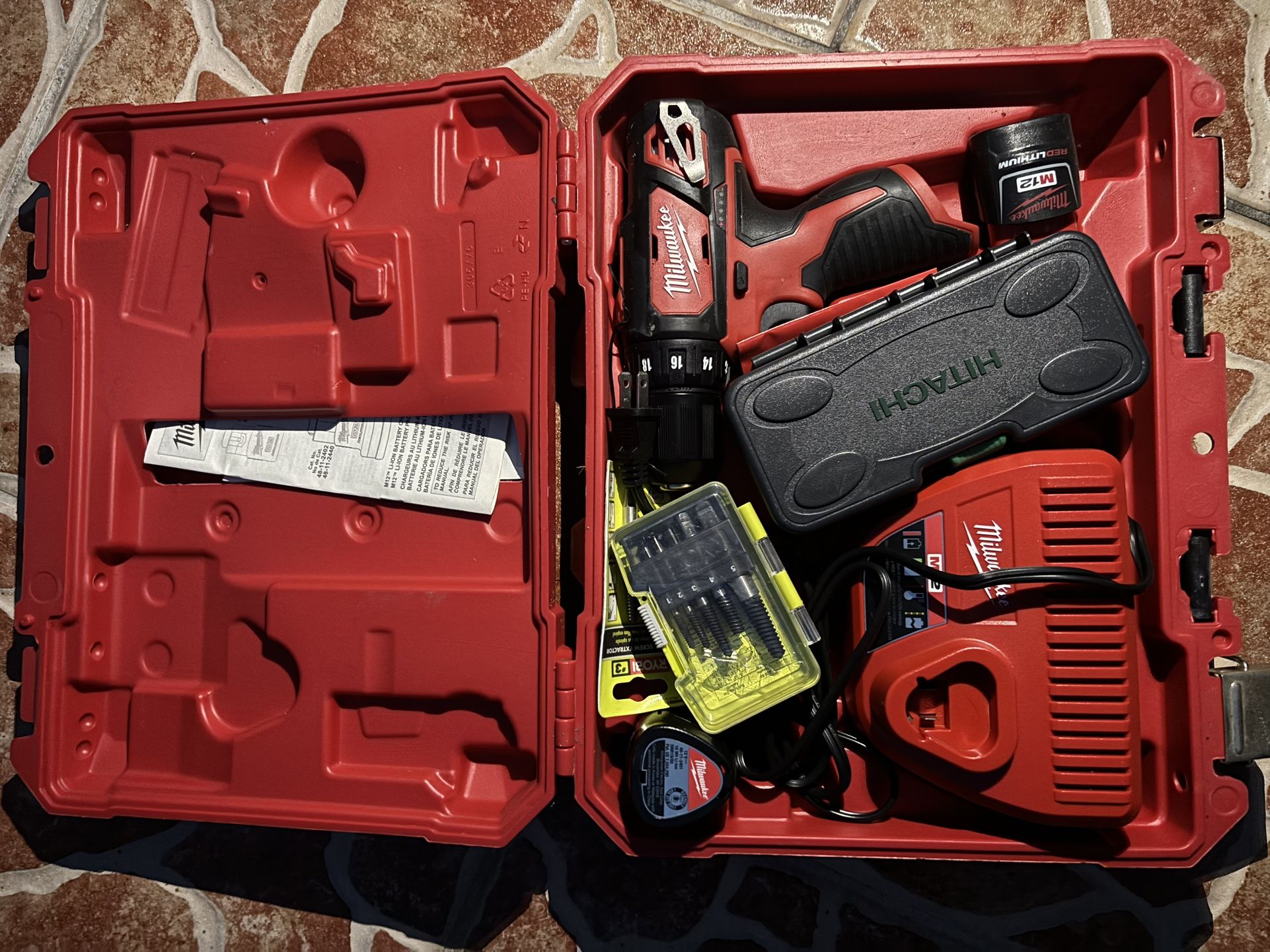 MILWAUKEE Cordless Hammer Drill Kit: 12V, Gen Purpose, 3/8 in Chuck, Keyless, 2, 22.9 ft-lb, 1.5 Ah and accessories