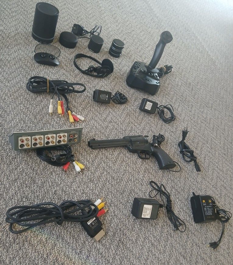 A total of 16 Different Video Game Accessories. Including Multiple Speakers, Adapters, Bluetooth Headset, Flight Stick, etc. Selling everything together for $80. AC-DC Adapter shown at the very right hand bottom corner is not available as it's not working.