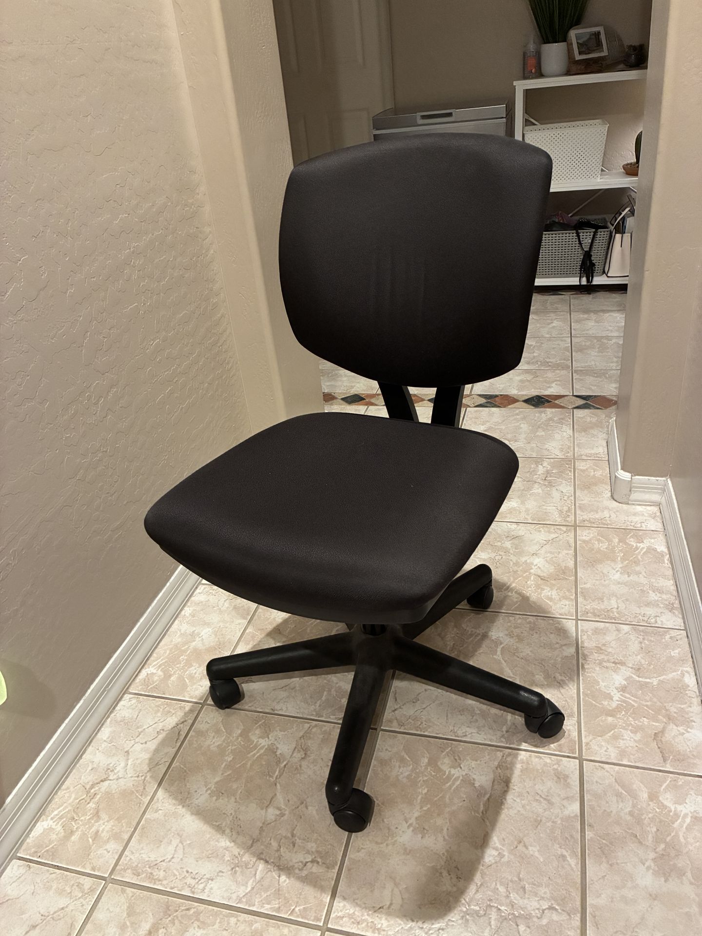 Heavy, commercial office chair. Black. Good condition, however height adjustment slips a little. Needs a new pneumatic cylinder.