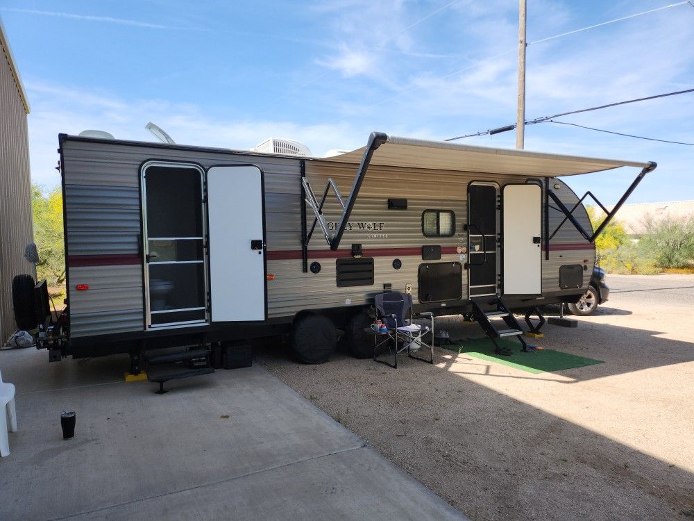 Very clean Travel trailer 1 large slide out new tires +spare, carrier rack on rear , all appliances work very well ,sleeps 6 to 8 people queen room bunkbeds couch turns to small bed small out door fridge and ice maker electric fireplace ,A/C and heat work great 2 propane tanks .No low balls..but willing to hear offers.