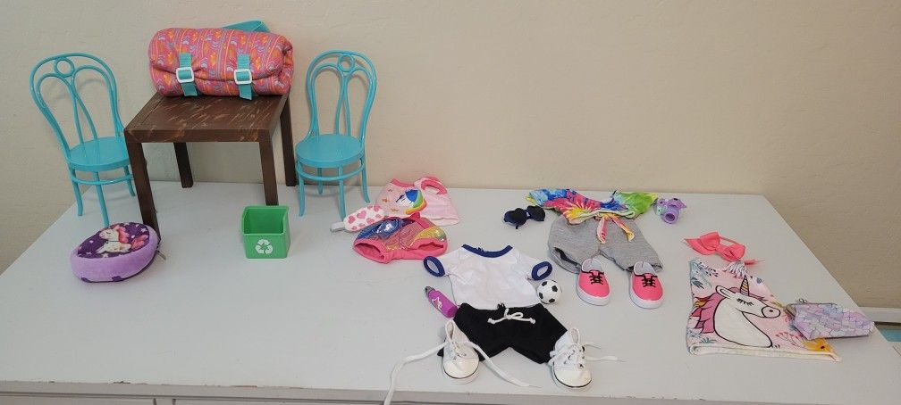 $15 for all: 4 outfits, 2 pair of shoes, 1 pair of sunglasses, camera, coin pouch, water bottle, soccer ball, sleeping mask, hair bow, recycle can, backpack, table, 2 chairs, sleeping bag. Everything is in great condition. Check my other listings for more doll stuff! Porch pickup, cross streets are Williams Field and Gilbert Rd. Cash or venmo please