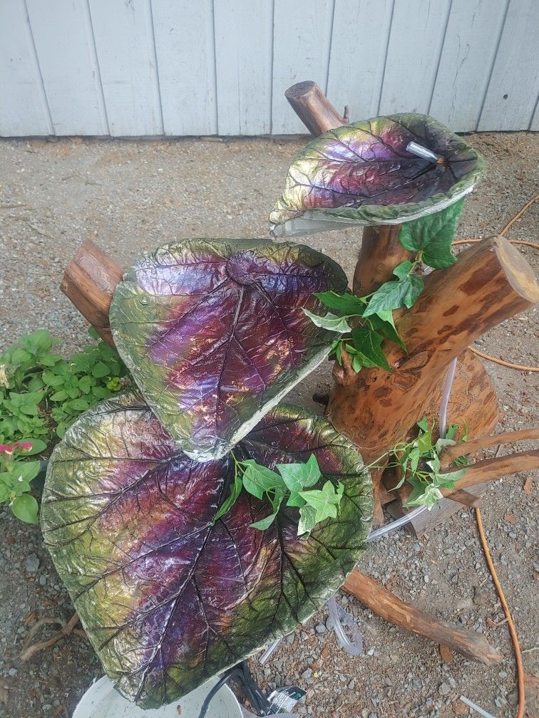 Beautifully crafted fountain very unique and ready to go. Take it home plug it in. comes with Water circulating pump get one while can seasonal i make my cement leaves from real rhubarb leaves. Not much time left