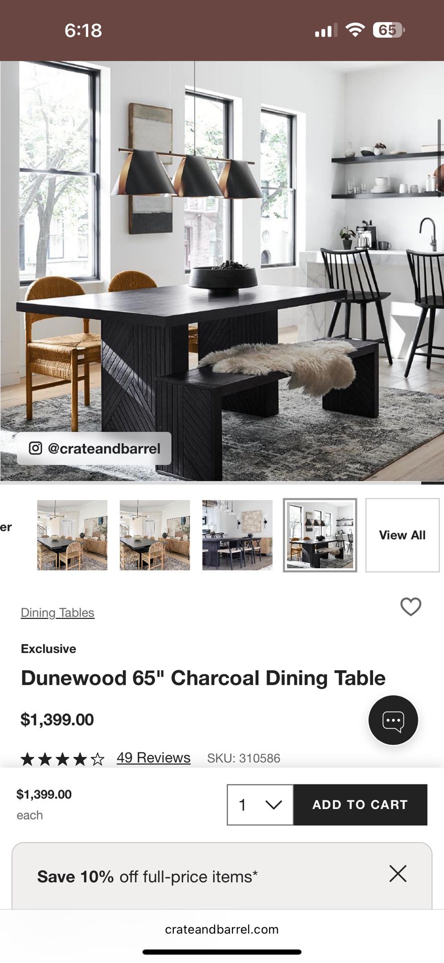 Crate & Barrel Dunewood 65" Black Charcoal Dining Table