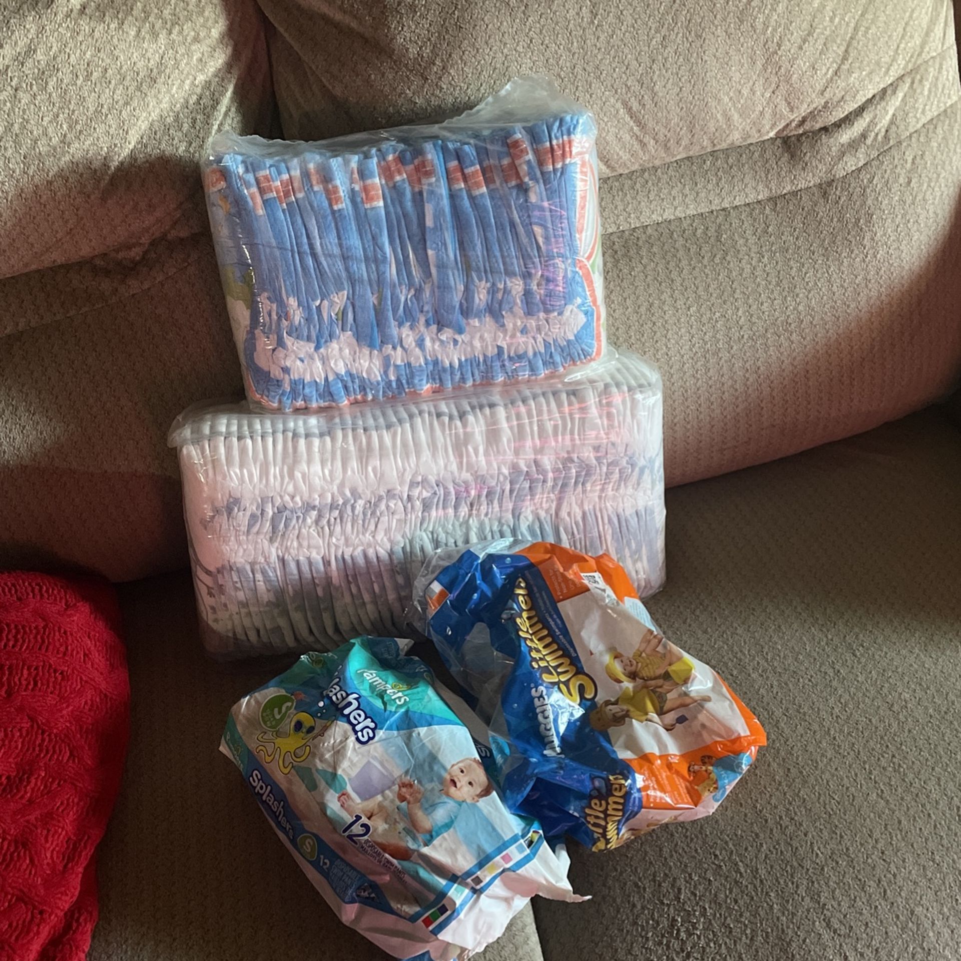 Pull ups size 2/3 T Mickey Mouse and frozen The frozen package I took one out of and that’s it the other one is brand new and the other ones are swim diapers  I counted 43 diapers in the frozen pack and 31 in the Mickey Mouse pack and 12 swim diapers