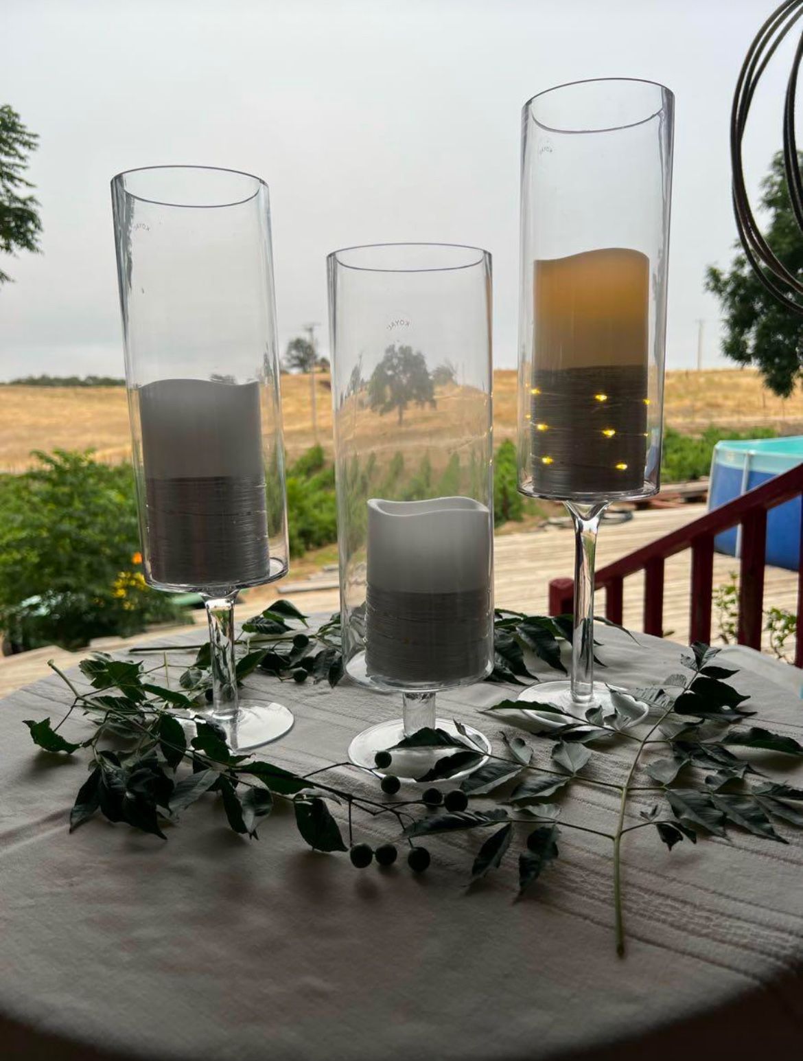 Set of 3 candle holders plus 3 flames candles is $45 total. I have 20 sets of three Pillar Candle Hurricane Pedestal Holders. $35 each set (Paid 47.50 in 2022 and they are still going for $45) I also have 17 sets of the three Silver Flickering Flameless LED Pillar Candles with Embedded String Lights. They run on battery and were used one night only. $10 each set (Paid $18.71 in 2022) FIRM ON PRICE but I will give a discount if someone wants to buy all or bulk number of sets.