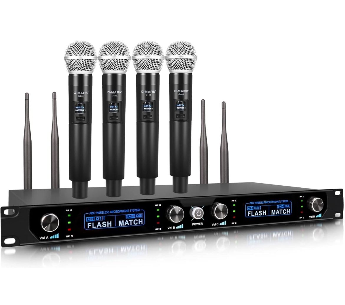 G-MARK Wireless Microphone System, 4 Channel Wireless Microphones with Rechargeable Handheld Mics, 250FT Range, UHF Metal Cordless Dynamic Mics Sets f