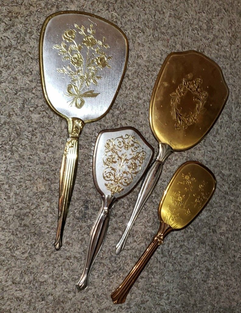 X4 VINTAGE ORNATE GOLD BRASS FILIGREE HOLLYWOOD REGENCY HANDHELD VANITY MIRROR & HAIR BRUSH SET