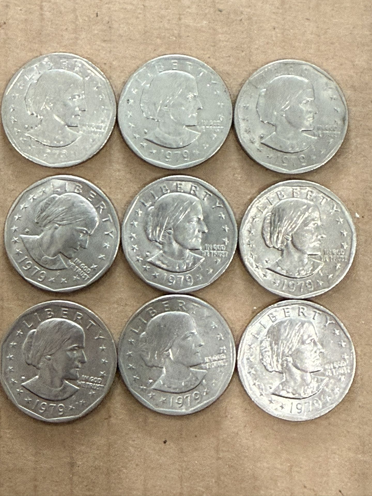 1979 circulated: Susan B Anthony silver dollar coin minted in Philadelphia, United States. Lot:(9-Coins). Narrow & Wide Rims. OFFERS!