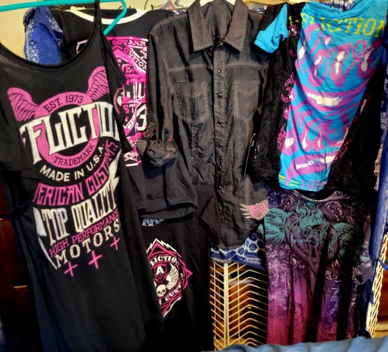 Affliction shirts 6 total black long sleeve new with tags retaill 88. All are small beside sinful purple med but fits like small an worn few times rest are like new worn couple times that's it tommarrow I'll be posting lots of medium an large Affliction shirts thanks